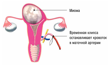 Суть лапароскопической миомэктомии по оригинальной методике заключается во временной окклюзии внутренних подвздошных артерий с помощью мягких атравматических клипс. После их наложения кровоток к матке приостанавливается. Затем проводится разрез миометрия над миоматозным узлом, после чего узел вылущивается. При используемой методике зона операции остается сухой и хорошо визуализируемой, нет необходимости в использовании коагуляции. После полного ушивания ложа удаленного узла сосудистые зажимы снимаются, приток крови к матке восстанавливается. Длительность оперативного вмешательства с использованием бескровной методики аналогична операции, проводимой стандартным способом. Однако существует целый ряд достоинств, которые существенно увеличивают безопасность и качество операции.