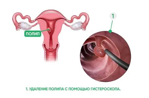 Удаление полипа сегодня выполняется в ходе гистерорезектоскопии через трансцервикальный доступ с помощью хирургических инструментов, введенных через канал гистероскопа. Удаление может быть проведено с использованием скальпеля, петли, методом выскабливания, коагуляции и др. Неполное удаление основания полипа в дальнейшем приведет к рецидиву.