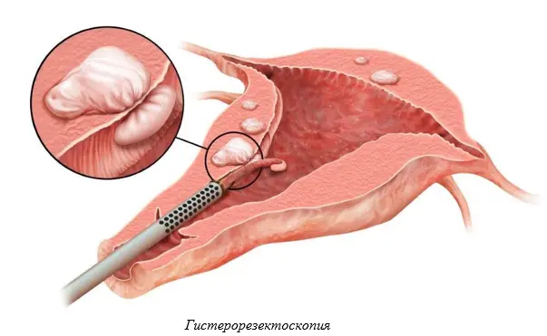 «Золотым» стандартом является гистерорезектоскопия — хирургическое удаление полипа, при этом используется видеоэндоскпическое оборудование — гистероскоп. Это наиболее щадящий метод, операция выполняется через вагинальный доступ, все манипуляции осуществляются с помощью хирургических микроинструментов, вводимых к месту операции через специальный канал гистероскопа. Суть операции — удаление полипа вместе с основанием с помощью различных инструментов: специальной петлей, скальпелем, методом выскабливания, коагуляции и др. При этом для полного разрушения патологического очага важно удалить полип вместе с подлежащей базальной мембраной, в противном случае не исключен рецидив.