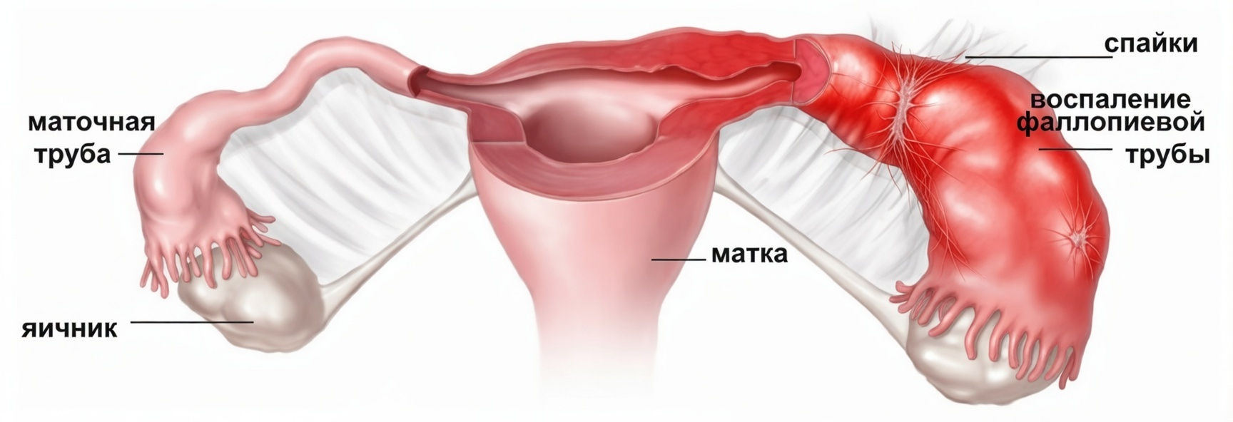 Кроме того, при прогрессировании воспалительного процесса экссудат, в котором в большом количестве присутствует фибрин, способствует формированию спаек в малом тазу, что также ухудшает репродуктивную функцию. Периовариальные спайки вокруг яичника усложняют выход яйцеклетки, перитубарные — возле фаллопиевых труб — препятствуют ее захвату.