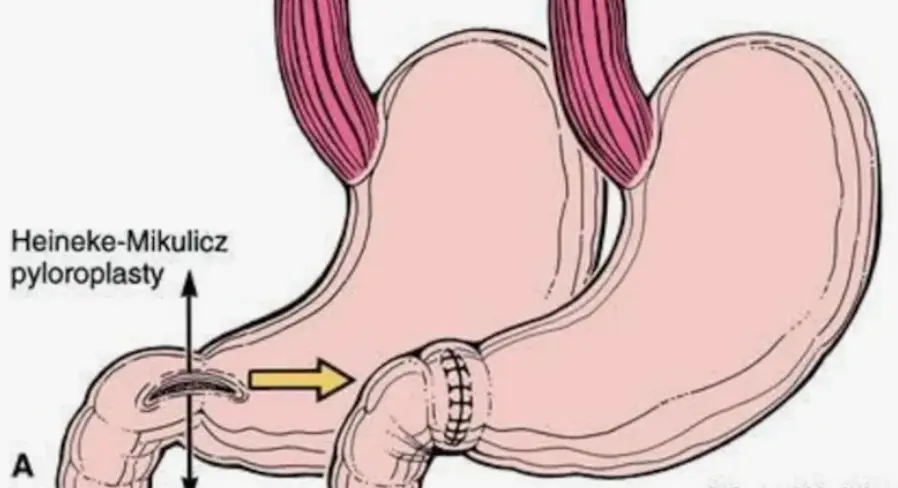 - пилоропластика по Гейнеке-Микуличу — заключается в продольном рассечении стенки желудка и двенадцатиперстной кишки проксимальнее и дистальнее привратника, но без повреждения слизистой, после чего серозный слой сшивается перпендикулярно по отношению к линии рассечения;