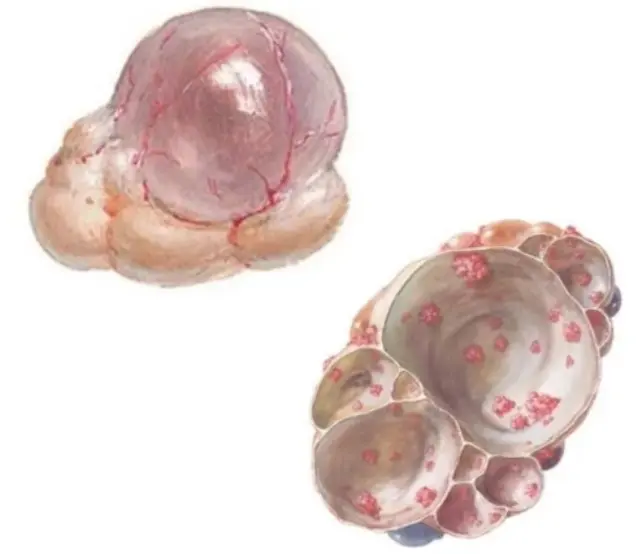 - Папиллярная (сосочковая) — для нее характерно появление небольших плотных разрастаний на широком основании, по виду напоминающих бородавки, которые растут от стенки к центру кистозного образования. Папиллярный вид может быть как однокамерным, так и иметь несколько камер, чаще пораженными оказываются оба яичника.