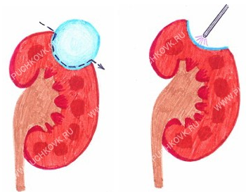 - удаление кисты почки в пределах здоровых тканей или обработка оставшейся оболочки электрохирургичским путём;;