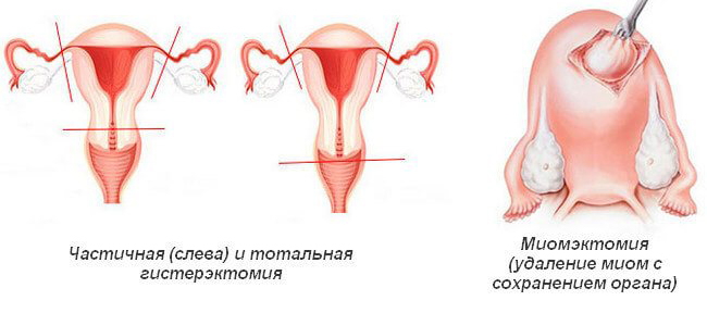 Единственно эффективный метод лечения миомы — это операция, во время которой удаляются все имеющиеся узлы. Методика проведения хирургического вмешательства подбирается в зависимости от величины и локализации опухоли, а также репродуктивных планов пациентки. Это может быть: