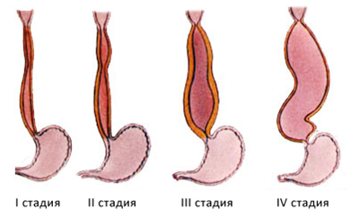 | III | появление рубцовых изменений в нижней части пищевода со стойким сужением, значительное расширение вышележащей части пищевода; |