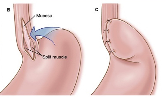 Рассечение части мышечного и рубцового слоя пищевода выполняется на протяжении 8-10 см, что гарантирует устранение стеноза. Для предупреждения развития недостаточности кардиального сфинктера и рефлюкс-эзофагита в дальнейшем также подходит укрепление зоны передней стенкой желудка с помощью антирефлюксной операции — фундопликации на 120 градусов.
